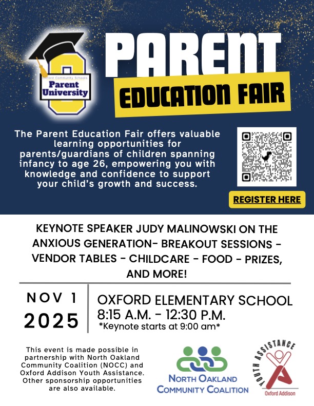 FUNd Run Winners Ride to School Days: Please be advised that on 10/28/25, 10/29/25, and 10/30/25 vehicles from Oxford Village Police, Oxford Fire Department, and Oakland County Sheriff will be in the parking lot during arrival. These departments have all generously donated their time to celebrate our top FUNd Run winners by giving them a ride to school.