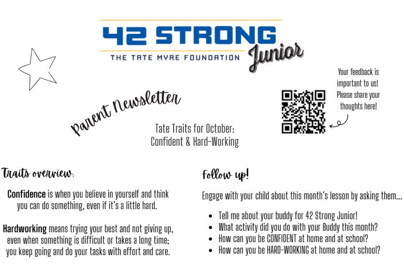 Classrooms started in October meeting with their PBIS Pals class on the opposite week of Second Step. Within this paring, one class is the "mentor" class (3rd, 4th, 5th grade) and one class is the "buddy" class (DK, K, 1st, and 2nd grade). Each month we will be sharing the traits reviewed as well as questions you can use at home to engage with your child. 42 Strong has also provided a QR code to gather feedback so that we can collaborate and reflect on how the program is going. We thank you in advance for taking the time to fill out the monthly survey.