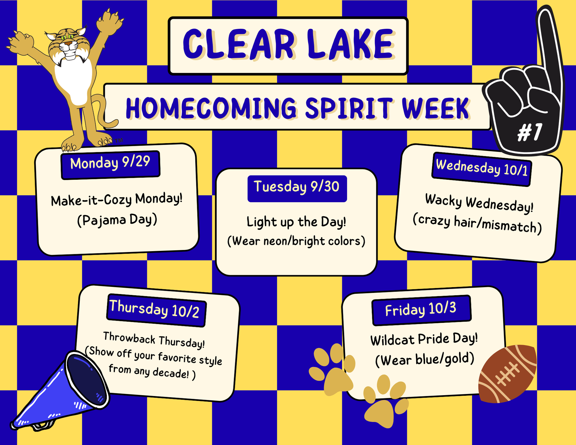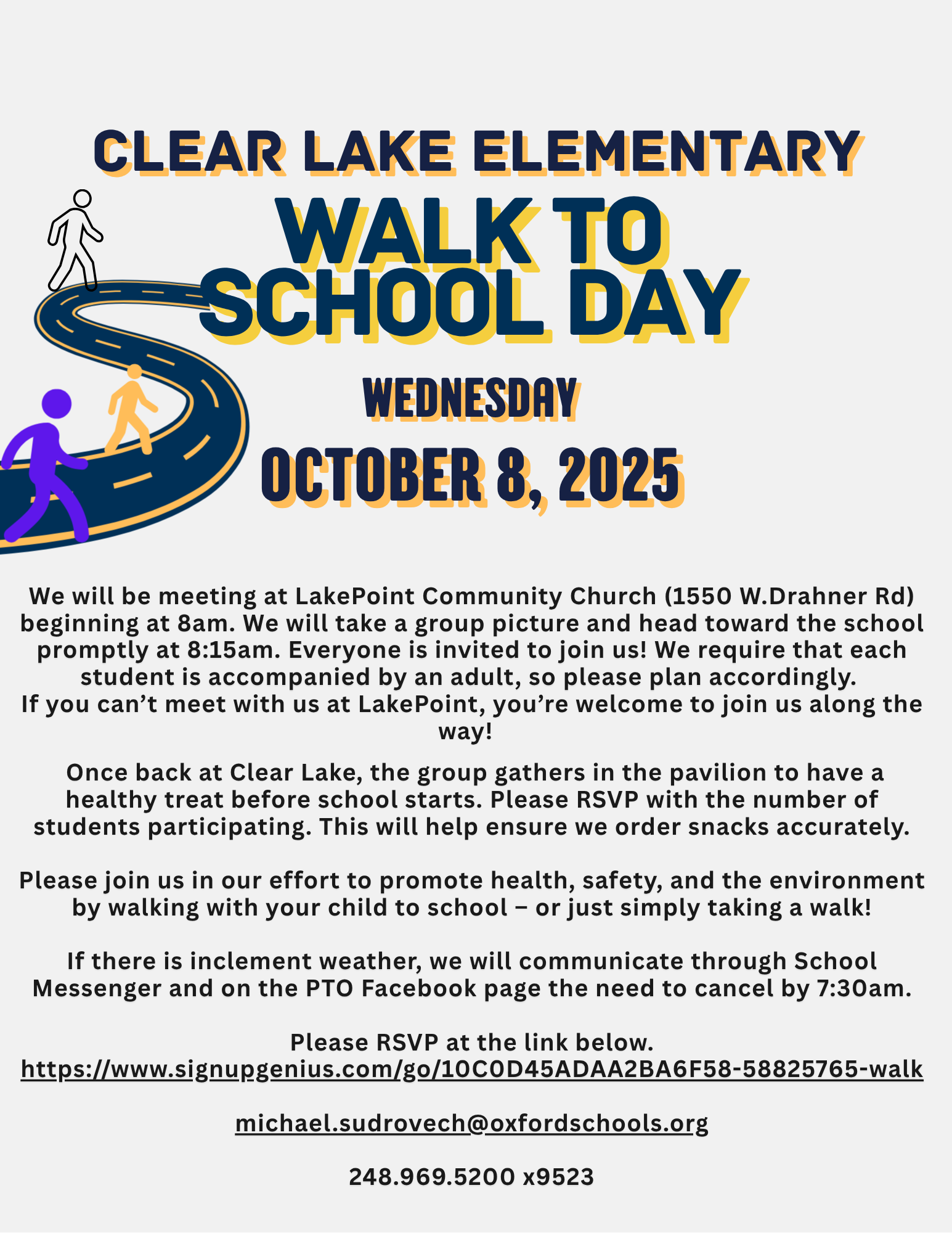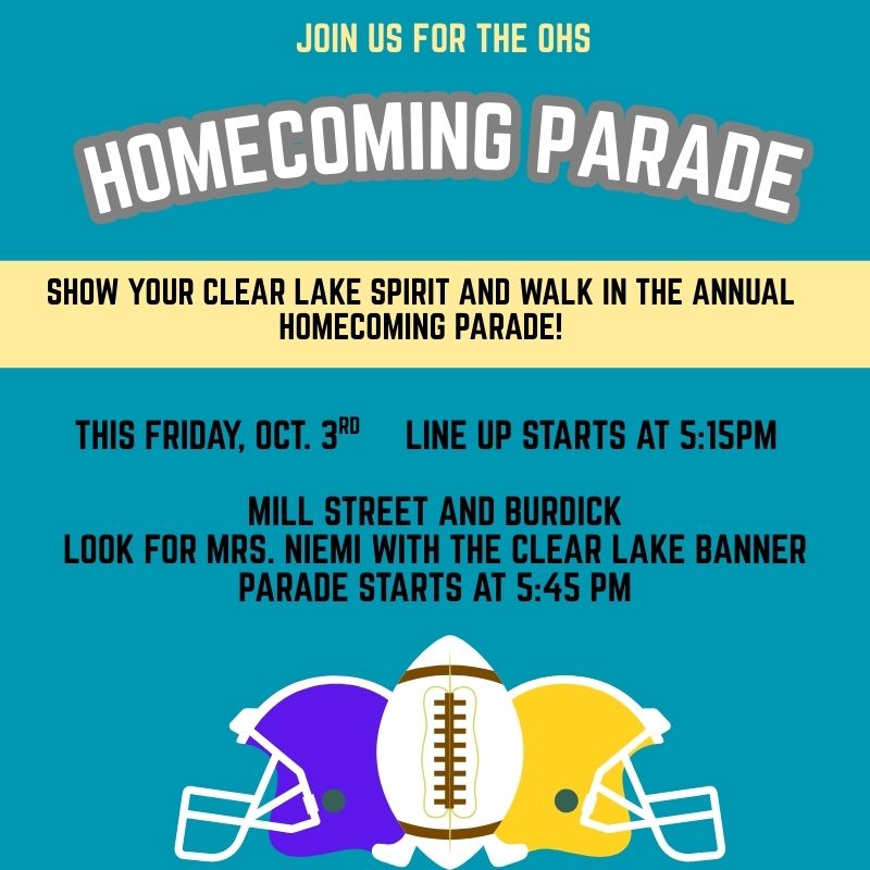 It's Oxford Homecoming week! Staff and students are invited to participate in our fun spirit week days as well as walk and represent Clear Lake in the Homecoming parade. All students are required to have a parent or guardian walk with them in the parade. |