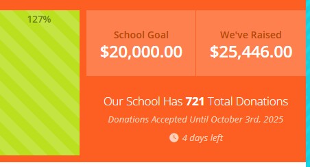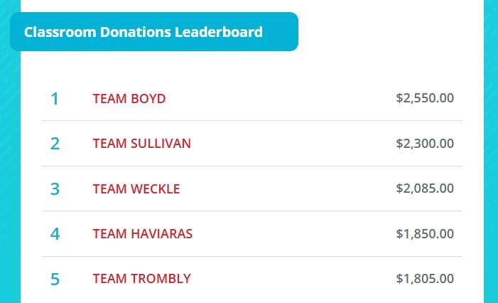 Currently we have raised $25,446 as a school and Mrs. Boyd's class is still hanging on to first place with only $250 separating them from Mrs. Sullivan's class!